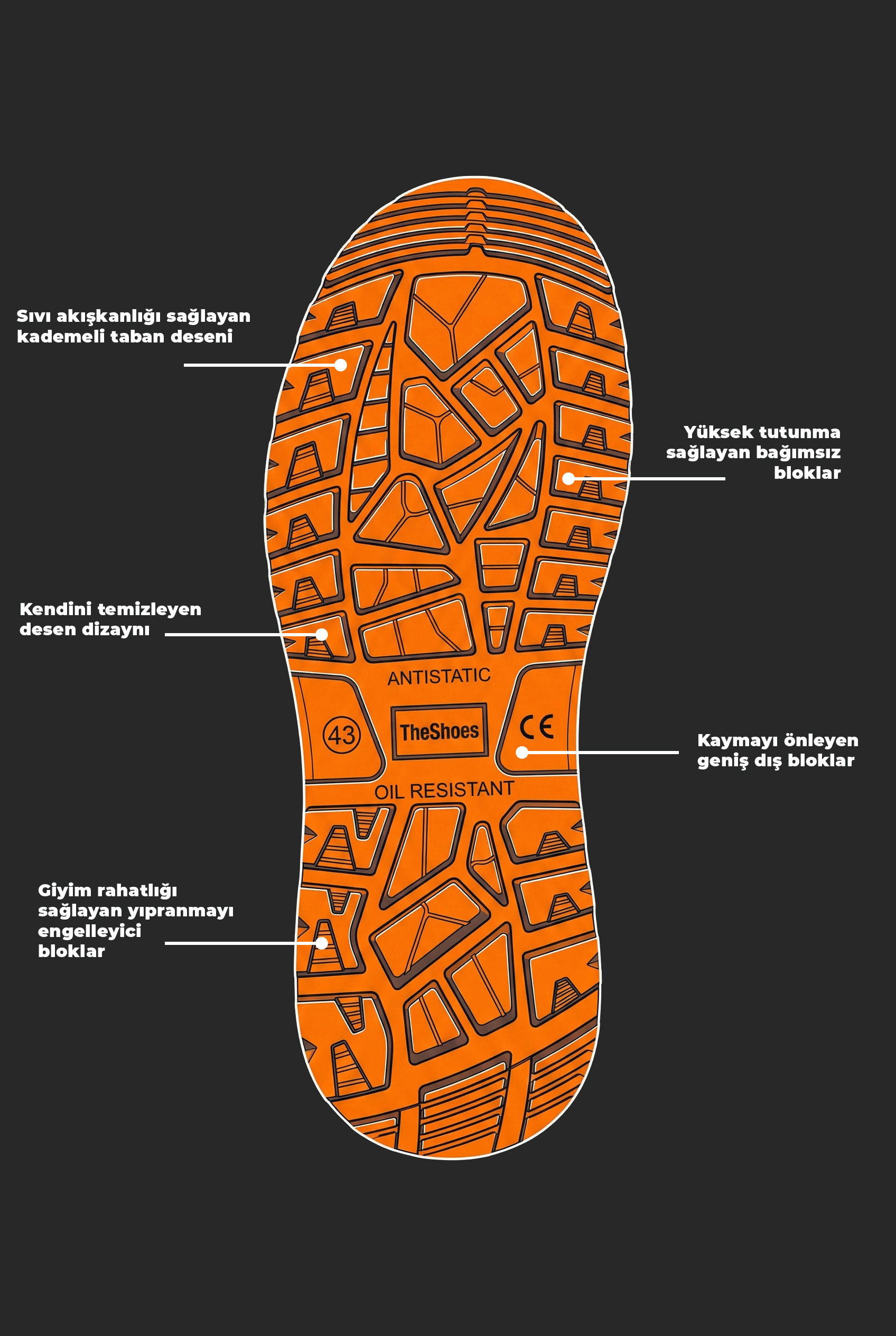 Ürünün en dikkat çekici özelliği olan ileri teknoloji taban tasarımı, yağa ve hidrokarbona karşı tam direnç göstererek en kaygan zeminlerde bile üstün yer tutuş performansı sergiler. Özel olarak geliştirilen kademeli taban deseni, sıvı akışkanlığını hızlandırarak su veya yağ birikintilerinde kaymayı önlerken; kendi kendini temizleyen kanal yapısı tabanda çamur ve moloz birikmesini engeller. Uzun mesai saatleri düşünülerek tasarlanan yıpranmayı engelleyici bloklar, ayakkabının ömrünü uzatırken aynı zamanda yürüyüş konforunu artırır. Hem iç hem de dış mekan kullanımına uygun olan TheShoes ile işinize odaklanırken, ayaklarınızın her adımda profesyonel bir koruma altında olduğundan emin olabilirsiniz.