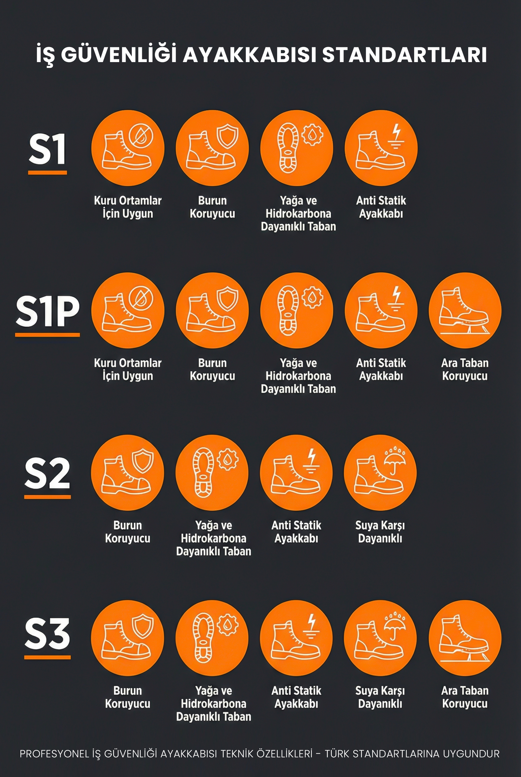 TheShoes iş güvenliği ayakkabısı, en zorlu çalışma sahalarında maksimum koruma ve gün boyu süren konforu bir arada sunmak için Türk standartlarına tam uyumlu olarak tasarlanmıştır. Darbelere karşı yüksek dirençli burun koruyucusu ve vücutta biriken statik elektriği tahliye eden anti-statik yapısı sayesinde iş kazası risklerini minimize ederken, şık siyah deri tasarımıyla profesyonel bir görünüm sunar. S1’den S3’e kadar farklı çalışma ortamlarının ihtiyaçlarını karşılayan bu özel model, kuru ortamlardan suya dayanıklılık gerektiren nemli zeminlere kadar geniş bir kullanım yelpazesine sahiptir. Ara taban koruyucusu desteğiyle batmalara karşı ayak tabanınızı güvence altına alan TheShoes, güvenliği bir standart haline getirir.